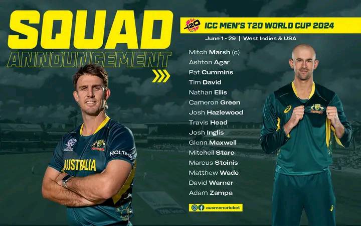 टोलीमा ट्राभिस हेड र ग्लेन म्याक्सवेल जस्ता स्टार खेलाडीलाई समावेश गरिएको छ । यसबाहेक अष्ट्रेलियाका टेष्ट र एकदिवसीय कप्तान प्याट कमिन्सलाई पनि टोलीमा राखिएको छ । प्याट कमिन्स हाल आईपीएल २०२४ मा सनराइजर्स हैदरावादको नेतृत्व गरिरहेका छन् । रोयल च्यालेन्जर्स बैंग्लोरबाट खेल्दा खासै राम्रो प्रदर्शन गर्न नसकेका अलराउन्डर क्यामरुन ग्रीनलाई पनि टोलीमा मौका दिइएको छ ।
