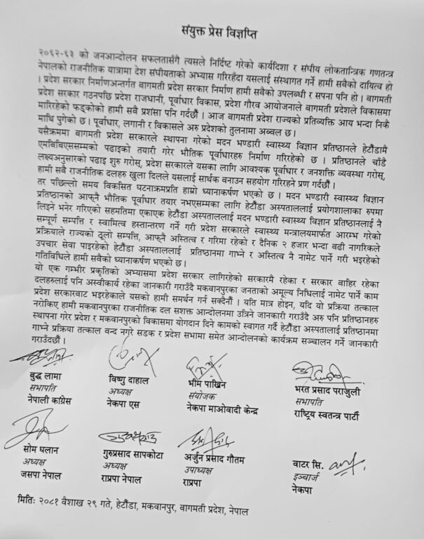विज्ञप्तिमा भनिएको छ, ‘यो एक गम्भीर प्रकृतिको अभ्यासमा प्रदेश सरकार लागिरहेको सरकारमै रहेका र सरकार बाहिर रहेका दलहरुलाई पनि अस्वीकार्य छ ।’ जारी विज्ञप्तिमा थप भनिएको छ ‘मकवानपुरका जनताको अमूल्य निधिलाई नामेट पार्ने काम प्रदेश सरकारबाट भइरहेकाले यसको हामी समर्थन गर्न सक्दैनौं। यति मात्र होइन, यदि यो प्रक्रिया तत्काल नरोकिए हामी मकवानपुरका राजनीतिक दल सशक्त आन्दोलनमा उत्रिने छौं । हेटौंडा अस्पतालाई प्रतिष्ठानमा गाभ्ने प्रक्रिया तत्काल बन्द नगरे सडक र प्रदेश सभामा समेत आन्दोलनको कार्यक्रम सञ्चालन गर्ने जानकारी गराउँदछौं ।’