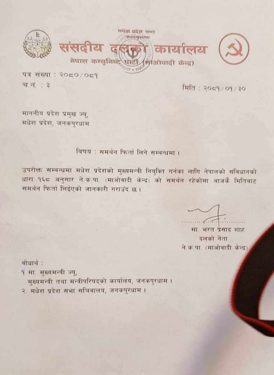 मधेश सरकारबाट आज नै राजीनामा दिएका माओवादी नेताहरु भरतकुमार साह र युवराज भट्टराईले मुख्यमन्त्री सरोजकुमार यादवलाई दिएको समर्थन फिर्ता लिएको पत्र प्रदेश प्रमुख कार्यालयका निमित्त सचिव लुम्बनाथ पोखरेललाई बुझाएका छन् ।