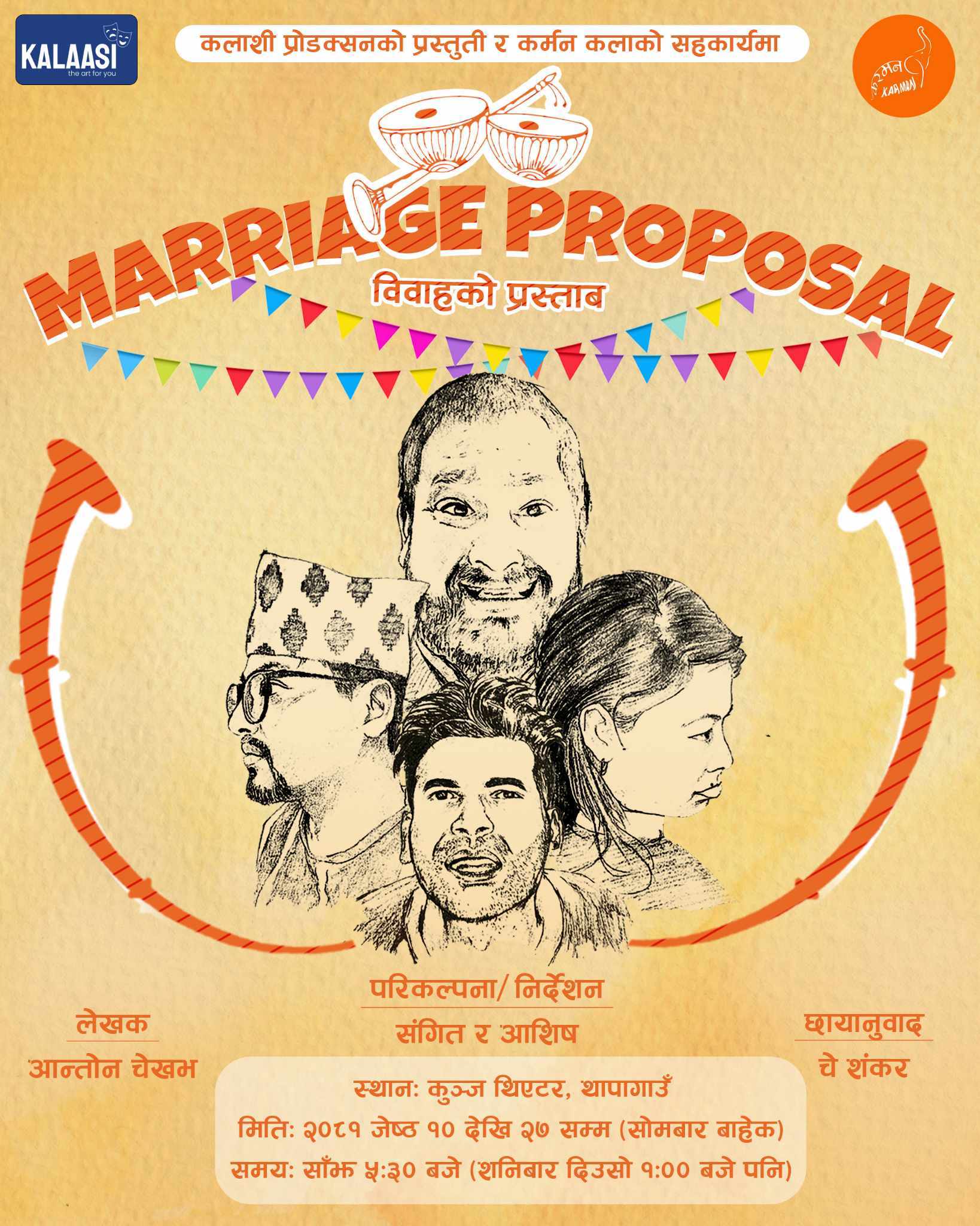 काठमाडौं । नाटक ‘म्यारीज प्रपोजल’ पुनः मञ्चन हुने भएको छ । आन्तोन चेखभको लेखनमा चे शंकरको छायानुवादमा नाटक ‘म्यारीज प्रपोजल’ कुञ्ज नाटक घरमा मञ्चन गर्न लागिएको हो ।