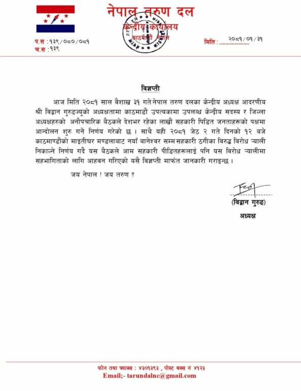 काठमाडौं । सहकारी ठगीमा संलग्नलाई कारबाही र हजारौँ बचतकर्ताको रकमको सुरक्षाको माग गर्दै नेपाल तरुण दलले विरोध प्रदर्शन गर्ने भएको छ ।