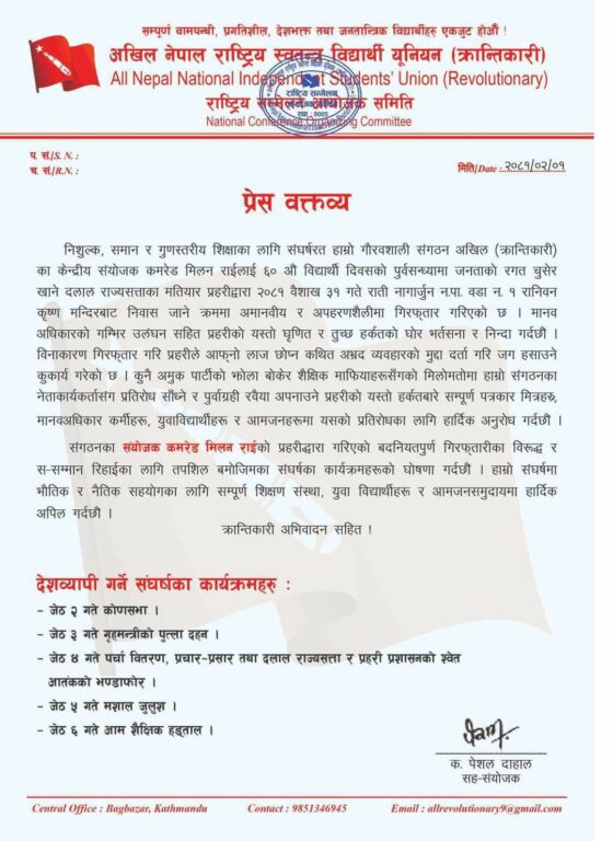 काठमाडौं । मोहन वैद्यनिकट अखिल क्रान्तिकारीका संयोजक मिलन राईलाई प्रहरीले पक्राउ गरेको भन्दै उक्त संगठनले शैक्षिक हड्तालको घोषणा गरेको छ । अखिल (क्रान्तिकारी)ले जेठ ६ गते शैक्षिक हडतालको घोषणा गरेको हो ।
