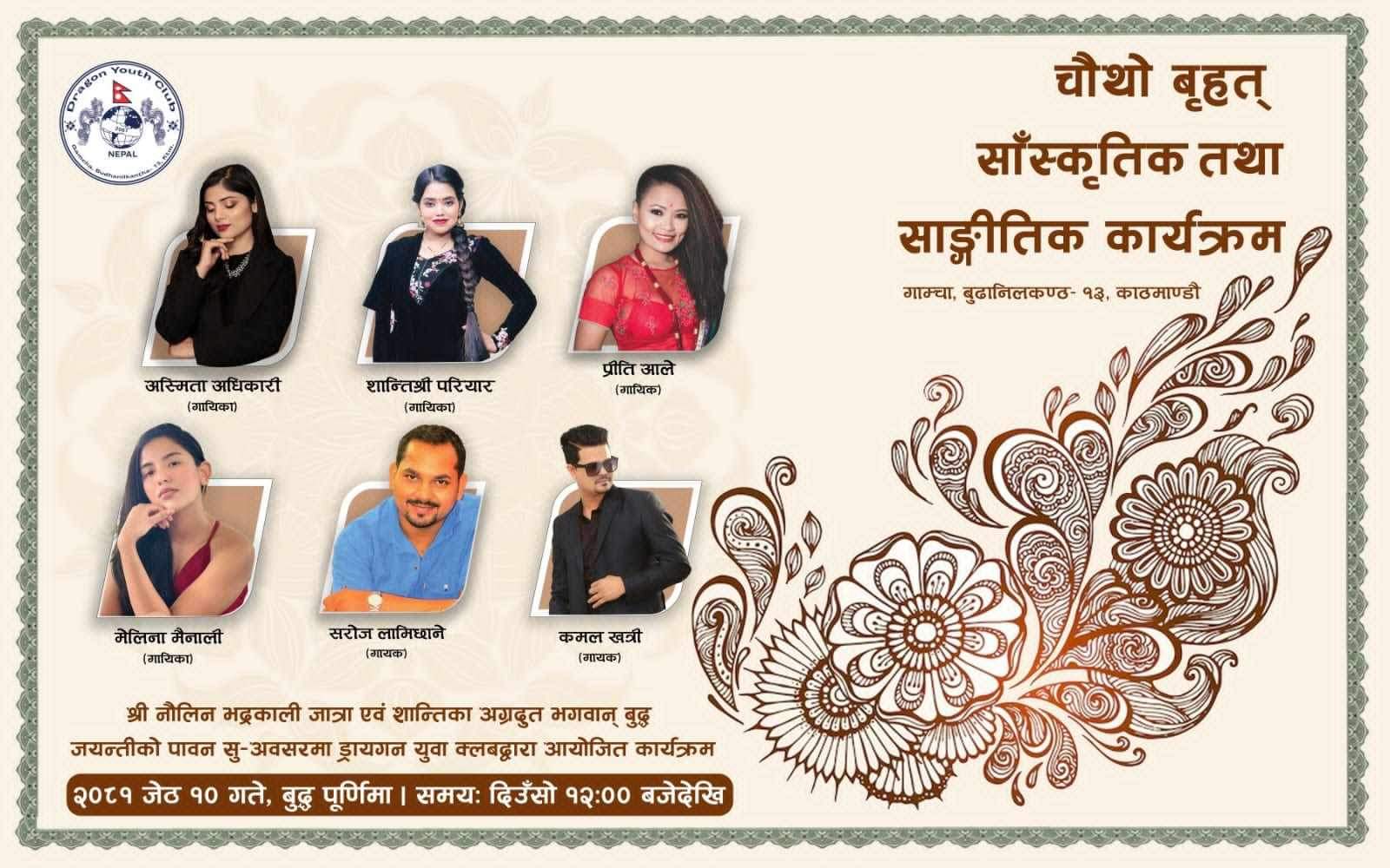 कार्यक्रम २०८१ जेठ १० गते, बुद्ध जयन्तिका दिन बुढानिलकण्ठ-१३, गाम्चा चौरमा सञ्चालन हुने आयोजकले जानकारी दिएका छन् । यस कार्यक्रममा स्थानीय कलाकारहरू लगायत शान्तिश्री परियार, अस्मिता अधिकारी, प्रीती आले, मेलिना मैनाली, सरोज लामिछाने र कमल खत्री समेतको प्रस्तुती रहनेछ ।