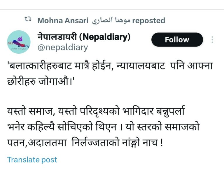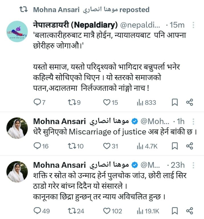 काठमाडौं । अदालतको फैसलालाई संकेत गर्दै अधिवक्ता मोहना अन्सारीले न्यायलयबाट छोरी बचाउनुपर्ने टिप्पणी गरेकी छिन् । नेपाल डायरी नामक ग्रुपको एक्स पोष्ट रिट्युट गर्दै अधिवक्ता अन्सारीले त्यस्तो टिप्पणी गरेकी हुन् ।