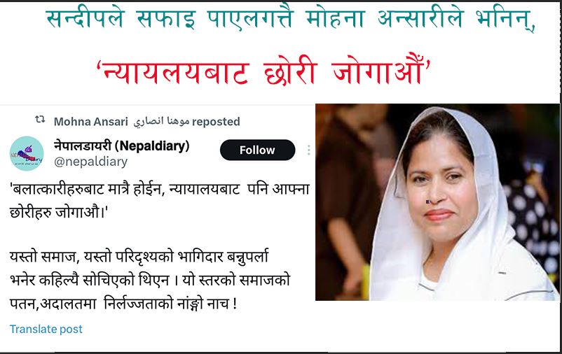 काठमाडौं । अदालतको फैसलालाई संकेत गर्दै अधिवक्ता मोहना अन्सारीले न्यायलयबाट छोरी बचाउनुपर्ने टिप्पणी गरेकी छिन् । नेपाल डायरी नामक ग्रुपको एक्स पोष्ट रिट्युट गर्दै अधिवक्ता अन्सारीले त्यस्तो टिप्पणी गरेकी हुन् ।
