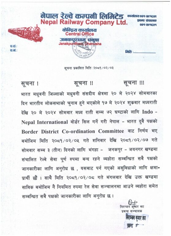 ‘यही जेठ ०५ गते शनिवार देखि ०७ गते सोमबार सम्म ३ (तीन) दिनको लागि भंगहा – जनकपुर – जयनगर खण्डमा संचालित रेल्वे सेवा पूर्ण रुपमा बन्द रहने व्यहोरा सम्बन्धित सबै पक्षको जानकारीका लागि अनुरोध छ । ०८ गते मंगलबार देखि उक्त खण्डमा साविक बमोजिम नै नियमित रुपमा रेल सेवा सञ्चालनमा आउने व्यहोरा समेत सम्बन्धित सबै पक्षको जानकारीका लागि अनुरोध छ ।’