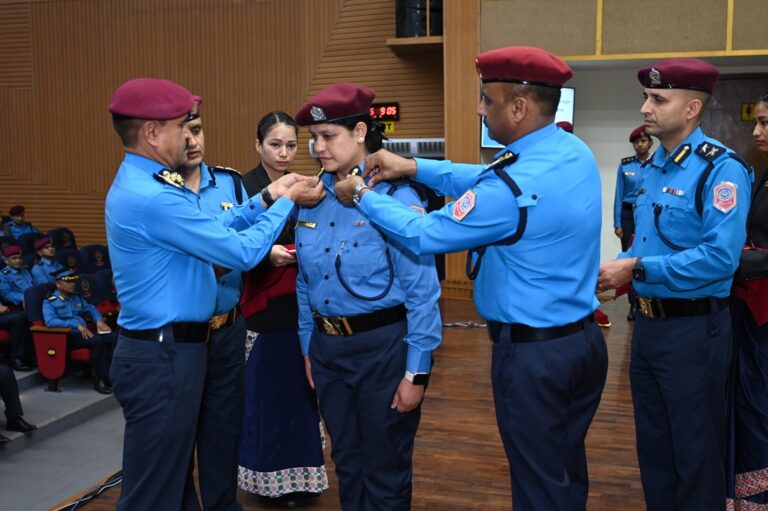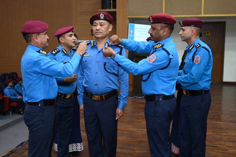 काठमाडौं । प्रहरी महानिरीक्षक बसन्त बहादुर कुँवरले हालै पदोन्नति भएका ९ जना प्राविधिक प्रहरी अधिकृतहरूलाई दर्ज्यानी चिन्हद्वारा सुशोभित भएका छन् ।