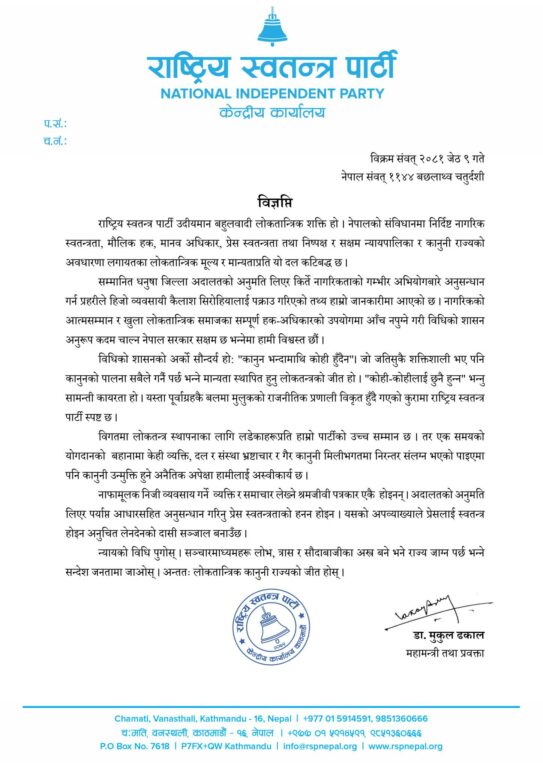 ‘विधिको शासनको अर्को सौन्दर्य हो : कानुन भन्दामाथि कोही हुँदैन । जो जतिसुकै शक्तिशाली भए पनि कानुनको पालना सबैले गर्नै पर्छ भन्ने मान्यता स्थापित हुनु लोकतन्त्रको जीत हो । कोही कोहीलाई छुनै हुन्न भन्नु सामन्ती कायरता हो । यस्ता पूर्वाग्रहकै बलमा मुलुकको राजनीतिक प्रणाली विकृत हुँदै गएको कुरामा राष्ट्रिय स्वतन्त्र पार्टी स्पष्ट छ,’ विज्ञप्तिमा अगाडि भनिएको छ,‘ विगतमा लोकतन्त्र स्थापनाका लागि लडेकाहरूप्रति हाम्रो पार्टीको उच्च सम्मान छ । तर एक समयको योगदानको  बहानामा केही व्यक्ति, दल र संस्था भ्रष्टाचार र गैर कानुनी मिलीभगतमा निरन्तर संलग्न भएको पाइएमा पनि कानुनी उन्मुक्ति हुने अनैतिक अपेक्षा हामीलाई अस्वीकार्य छ ।’