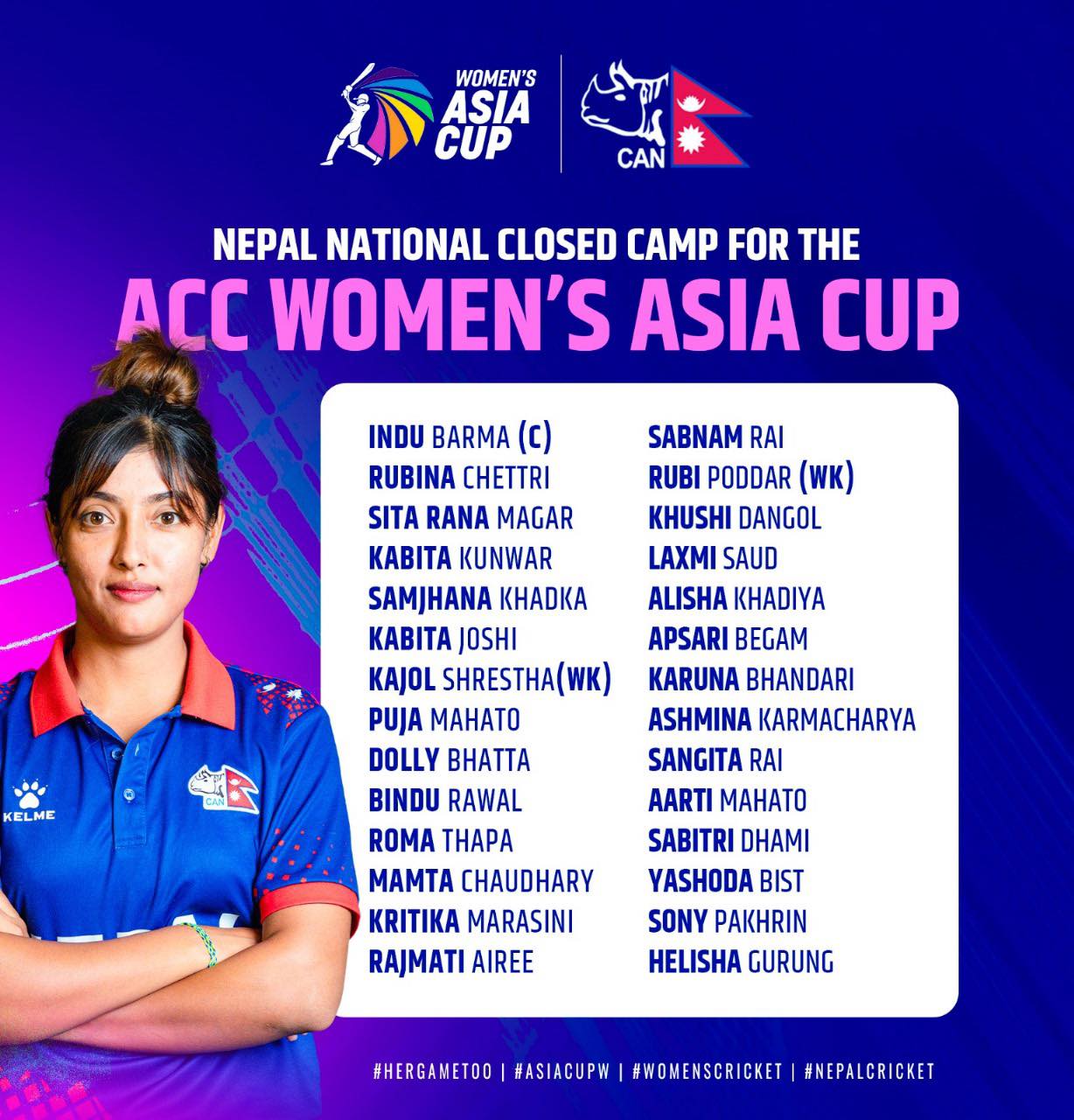 क्यानले बिहीबार २८ खेलाडी सहभागी प्रारम्भिक टोली घोषणा गरेको छ । प्रारम्भिक टोलीमा इन्दु बर्माको कप्तानीमा २८ खेलाडी छानिएको र उनीहरुलाई क्लोज क्याम्पबाट छनोट पश्चात् अन्तिम टोलीमा पुर्याइने क्यानले जनाएको छ ।