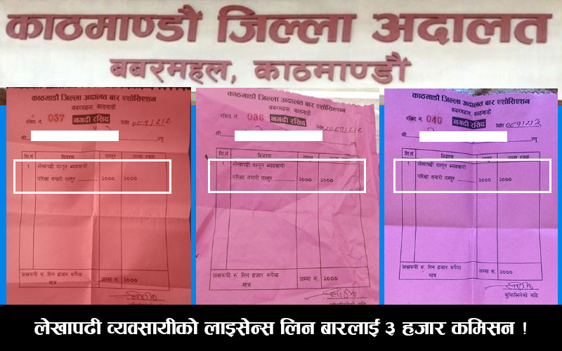 काठमाडौँ जिल्ला अदालतबाट जारी सूचना अनुसार लेखापढी व्यवसाय गर्न इच्छुक व्यक्तिहरू लाइसेन्स परीक्षाको फारम भर्न भन्दै काठमाडौँ जिल्ला अदालतसँगै रहेको काठमाडौँ जिल्ला अदालत बारको कार्यालय पुगे । तर त्यहाँ राजस्व बुझाउने एक सय रुपैयाँले पुगेन, बरु बारलाई प्रति फारक तीन हजार रुपैयाँ बुझाउनु पर्ने भयो । लोकपथलाई प्राप्त केही रसिद अनुसार उनीहरूले प्रतिव्यक्ति प्रति फारम तीन हजार रुपैयाँ दस्तुर उठाएर फारम दर्ता गरिरहेका छन् ।