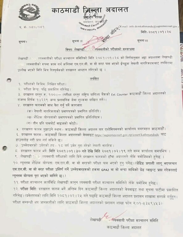 काठमाडौं जिल्ला अदालतले गत वैशाख २८ गते एक सूचना प्रकाशित गर्दै अड्डा अदालतमा लेखापढी व्यवसाय गर्न इच्छुक व्यक्तिहरूलाई लिखित परीक्षा लिई लाइसेन्स दिने भन्दै सूचना प्रकाशित गरेको थियो । उक्त सूचनामा प्रति फारक एक सय रुपैयाँ राजस्व लाग्ने उल्लेख गरिएको थियो र फारम बुझाउने स्थानका रूपमा काठमाडौँ जिल्ला अदालत बारको कार्यालय तोकिएको थियो ।