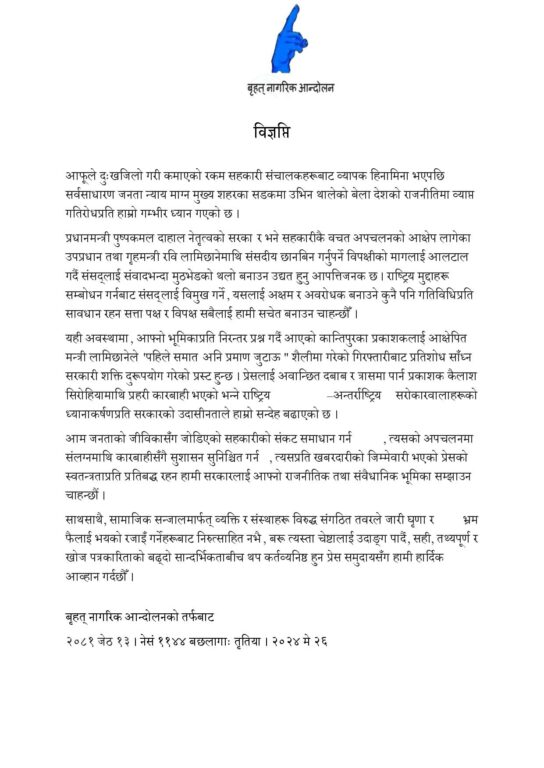 ‘आम जनताको जीविकासँग जोडिएको सहकारीको संकट समाधान गर्न, त्यसको अपचलनमा संलग्नमाथि कारबाहीसँगै सुशासन सुनिश्चित गर्न, त्यसप्रति खबरदारीको जिम्मेवारी भएको प्रेसको स्वतन्त्रताप्रति प्रतिबद्ध रहन हामी सरकारलाई आफ्नो राजनीतिक तथा संवैधानिक भूमिका सम्झाउन चाहन्छौं,’ आन्दोलनले विज्ञप्ति जारी गर्दै भनेको छ ।