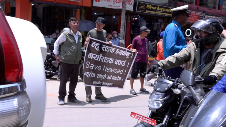 काठमाडौं । न्यूरोड क्षेत्रको सडक साँघुरो गरेर फुटपाथ बढाउने काठमाडौं महानगरपालिकाको निर्णयविरुद्ध स्थानीय बासिन्दा आन्दोलित भएका छन् ।