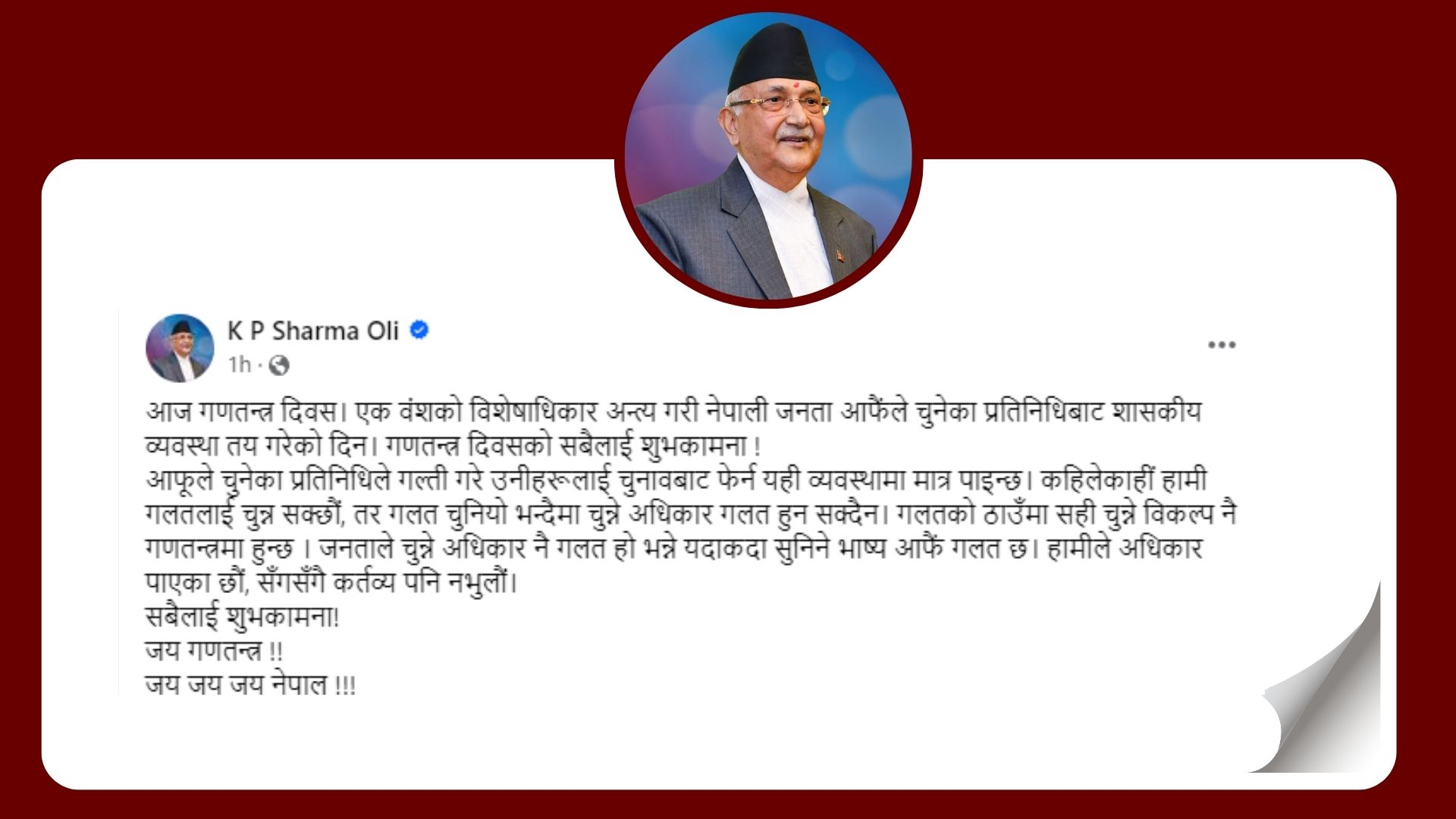 मंगलबार १७औँ गणतन्त्र दिवसको सन्दर्भमा अध्यक्ष ओलीले शुभकामना सन्देश दिँदै गलतको ठाउँमा सही चुन्ने विकल्प नै गणतन्त्र भएको बताएका छन् । ‘आजको दिन एक वंशको विशेषाधिकार अन्त्य गरी नेपाली जनता आफैँले चुनेका प्रतिनिधिबाट शासकीय व्यवस्था तय गरेको दिन हो,’ अध्यक्ष ओलीले भनेका छन्, ‘आफैँले चुनेका प्रतिनिधिले गल्ती गरे उनीहरुलाई चुनावबाट फेर्न यही व्यवस्थामा मात्रै पाइन्छ । कहिलेकाही हामी गलतलाई चुन्न सक्छौँ । तर गलत चुनियो भन्दैमा चुन्ने अधिकार गलत हुन सक्दैन ।