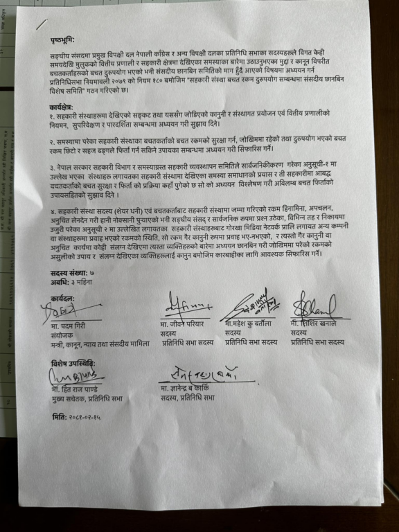 कार्यदलका एक सदस्यका अनुसार संसदीय छानबिन समितिले समग्र सहकारीको संरचनात्मक समस्या, समस्याग्रस्त सहकारीहरुको अध्ययन, गोर्खा मिडिया नेटवर्कमा पैसा ल्याउने सहकारीहरुको छानबिन गर्ने र सहकारीको पैसा ल्याउनुमा गोर्खा मिडियाका पदाधिकारीहरुको भूमिकाको अध्ययन गर्ने जस्ता विषय कार्यादेशमा रहनेछ ।