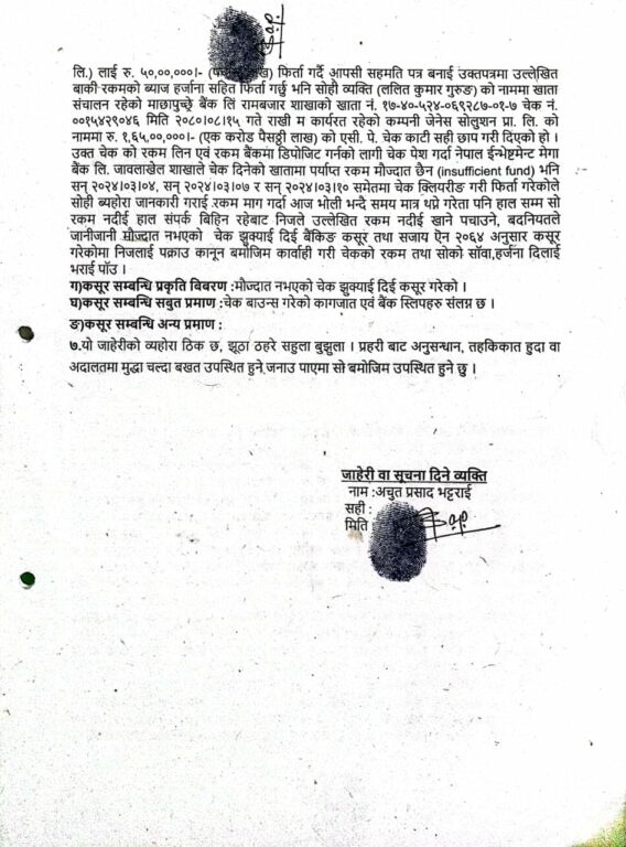 त्यसपछि सो कम्पनीले गुरुङलाई सम्पर्क गरी रकम फिर्ता माग्दा उनले ५० लाख फिर्ता दिएका र बाँकी रकमको साँवा ब्याज समेत एक करोड ६५ लाखको एकाउन्ट पेइ चेक जेनेस सलुशनलाई दिएका थिए । नेपाल इन्भेष्टमेन्ट मेगा बैंक लिमिटेडको जावलाखेल शाखामा उक्त चेक साट्न पटक–पटक जाँदा बैंकले गुरुङको खातामा पर्याप्त रकम नरहेको जानकारी दिएको थियो । त्यसपछि कम्पनीले गुरुङविरुद्ध उजुरी दिएको हो ।