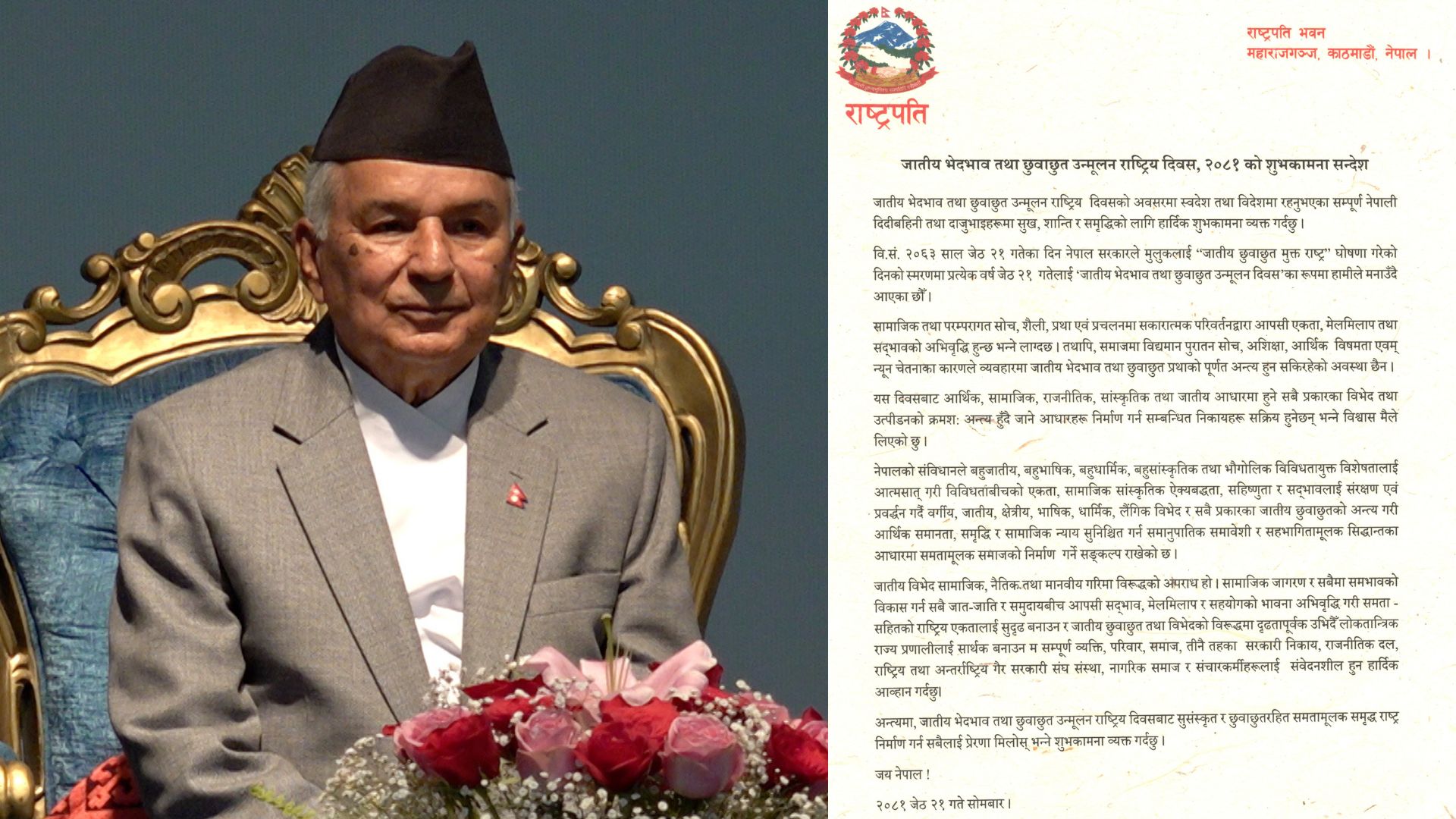 सोमबार जातीय भेदभाव तथा छुवाछुत उन्मूलन राष्ट्रिय दिवसको सन्दर्भमा शुभकामना सन्देश जारी गर्दै राष्ट्रपति पौडेलले कानून, संविधान र संसद्ले जातीय भेदभाव तथा छुवाछुतलाई निषेध गरेपनि समाजमा अझैपनि पूर्णरुपले अन्त्य हुन नसकेकोप्रति चिन्ता व्यक्त गरेका छन् ।