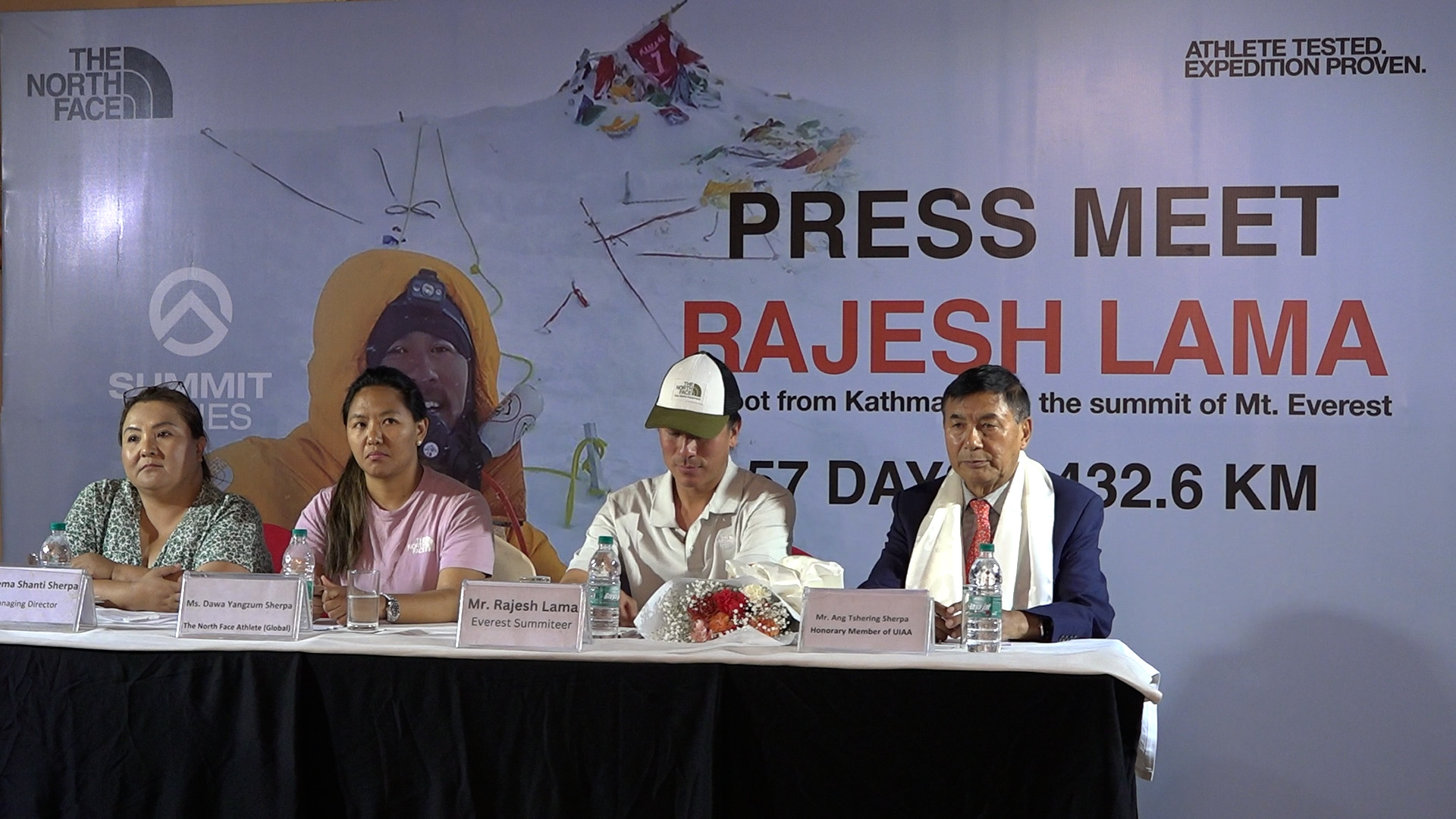 काठमाडौं । घरबाट पैदल निस्केर ५७ दिनमा सगरमाथा शिखरको सफल आरोहण गरेका राजेश लामा सम्मानित भएका छन् ।नर्थ फेस नेपालले उनलाई मंगलबार काठमाडौंमा सम्मान गरेको हो । आरोहीहरु सगरमाथा आधार शिविरसम्म पुग्नुअघि निकै धेरै सवारीसाधन प्रयोग गर्छन् । लुक्लासम्म पुग्न पनि हवाई सेवा उपयोग गर्छन् । तर, लामाले परम्परागत आरोहणभन्दा फरक तवरले सर्वोच्च शिखरको यात्रा तय गरेका हुन् ।