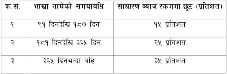 २०८० चैत्र मसान्त सम्ममा भाखा नाघेका कर्जाहरूको हकमा सम्बन्धित ऋणीले सम्पूर्ण कर्जा रकम २०८१ जेठ महिना भित्रमा चुक्ता भुक्तान गरेमा जरिवाना तथा हर्जाना रकममा शत प्रतिशत छुट र साधारण बक्यौता ब्याज रकममा समेत देहायको तालिकामा उल्लेख भएबमोजिम छुट प्रदान गर्ने बैंकले जानकारी दिएको छ ।