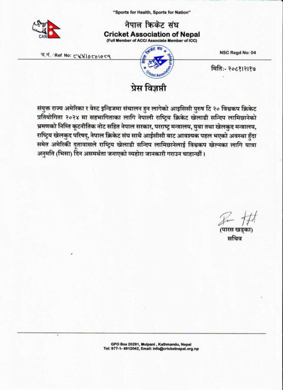 संघका सचिव पारस खड्काद्वारा हस्ताक्षरित विज्ञप्तिमा ‘नेपाली राष्ट्रिय क्रिकेट खेलाडी सन्दीप लामिछानेको भ्रमणको निम्ति कुटनीतिक नोटसहित नेपाल सरकार, परराष्ट्र मन्त्रालय, युवा तथा खेलकुद मन्त्रालय, राष्ट्रिय खेलकुद परिषद्, नेपाल क्रिकेट संघका साथै आइसीसीबाट आवश्यक पहुँदा हुँदासमेत अमेरिकी दूतावासले राष्ट्रिय खेलाडी सन्दीप लामिछानेलाई विश्वकप खेल्नका लागि यात्रा अनुमति (भिसा) दिन असमर्थता जनाएको व्यहोरा जानकारी गराउन चाहन्छौं,’ भनिएको छ ।