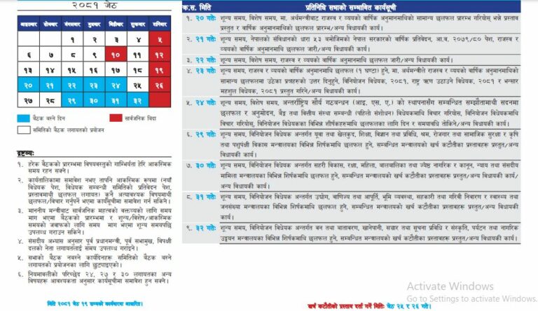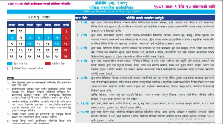 वेभसाइटबाट सार्वजनिक क्यालेण्डरमा अब जेठमा ४ दिन र असारमा ७ दिन प्रतिनिधि सभा बैठक बस्ने उल्लेख छ ।