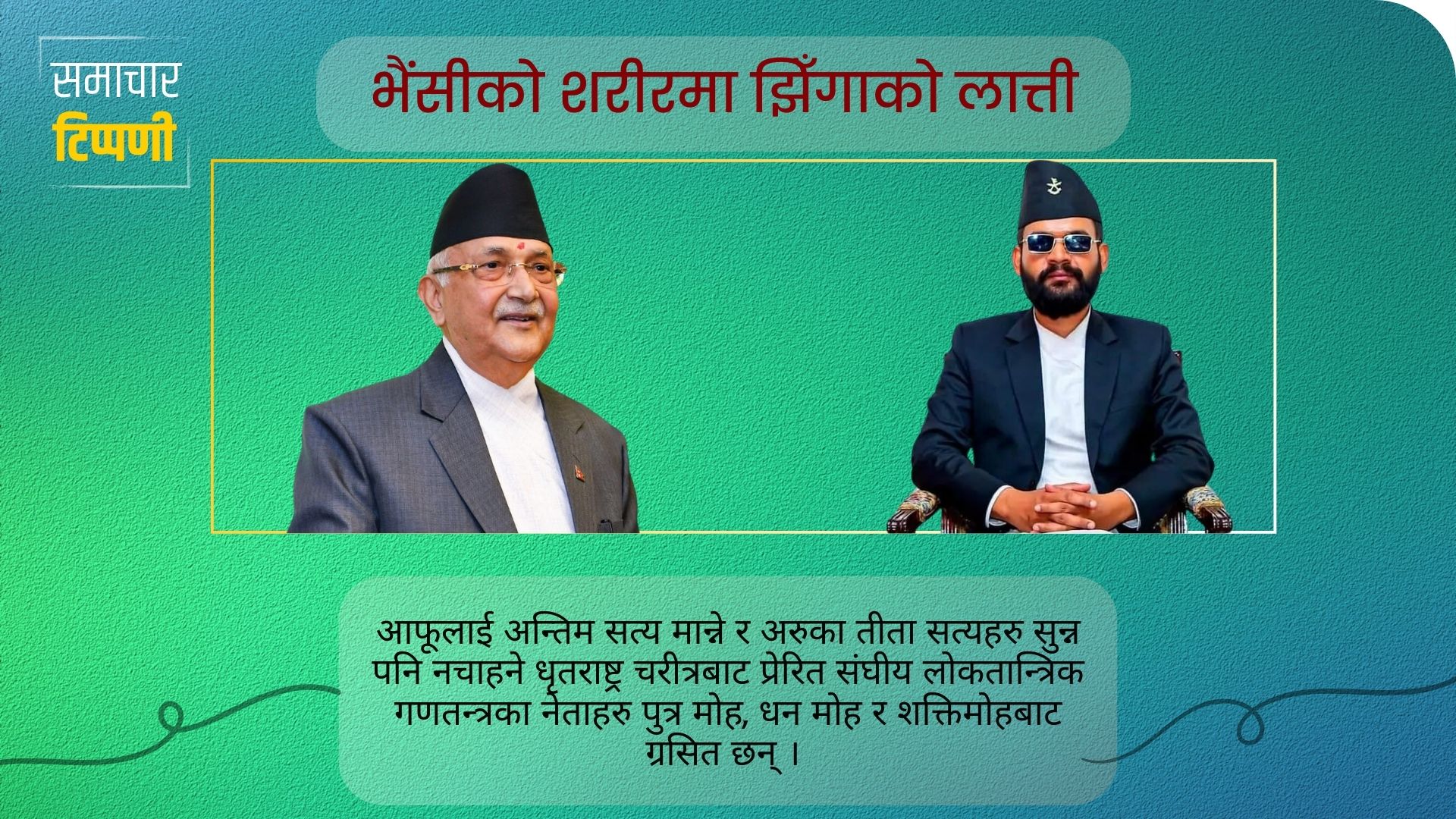 आफूलाई नै अन्तिम सत्य मान्ने र अरुका तीता सत्यहरु सुन्न पनि नचाहने धृतराष्ट्र चरित्रबाट प्रेरित संघीय लोकतान्त्रिक गणतन्त्रका नेताहरु पुत्रमोह, धनमोह र शक्तिमोहबाट ग्रसित छन् । चर्मचक्षु सबल भएपनि धृतराष्ट्र झैं नेत्रहीन बनेका नेताहरु देशलाई हस्तिनापुरको गतिमा पु¥याउन प्रतिस्पर्धा गरिरहेका छन् ।