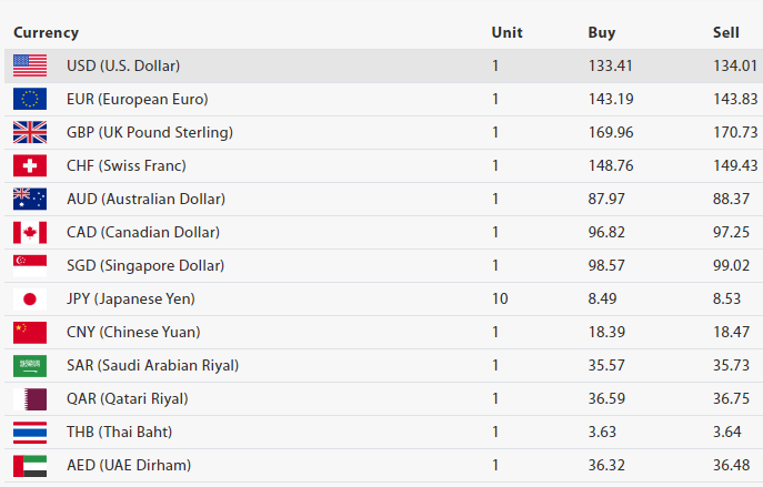 काठमाडौं । नेपाल राष्ट्र बैंकले बुधबारका लागि विदेशी मुद्राको विनिमयदर सार्वजनिक गरेको छ । राष्ट्र बैंकका अनुसार आज अमेरिकी डलर एकको खरिद दर १३३ रुपैयाँ ४१ पैसा रहेको छ भने बिक्री दर १३४ रुपैयाँ ०१ पैसा रहेको छ । मंगलबार खरिद दर १३३ रुपैयाँ ३२ पैसा र बिक्री दर १३३ रुपैयाँ ९२ पैसाका दरले कारोबार भएको थियो ।