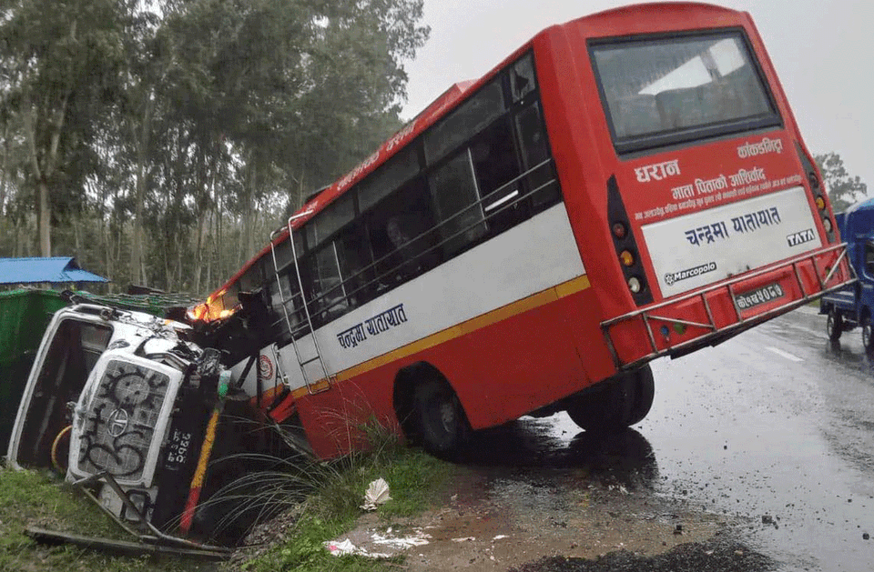 पूर्वपश्चिम राजमार्गअन्तर्गत कमल–४ मा बा३ ख २१६६ न.को टिपर र विपरीत दिशातर्फबाट जाँदै गरेको को १ ख ५०८७ न.को यात्रुबाहक बस एकापसमा ठक्कर खाएर दुर्घटना भएको हो ।