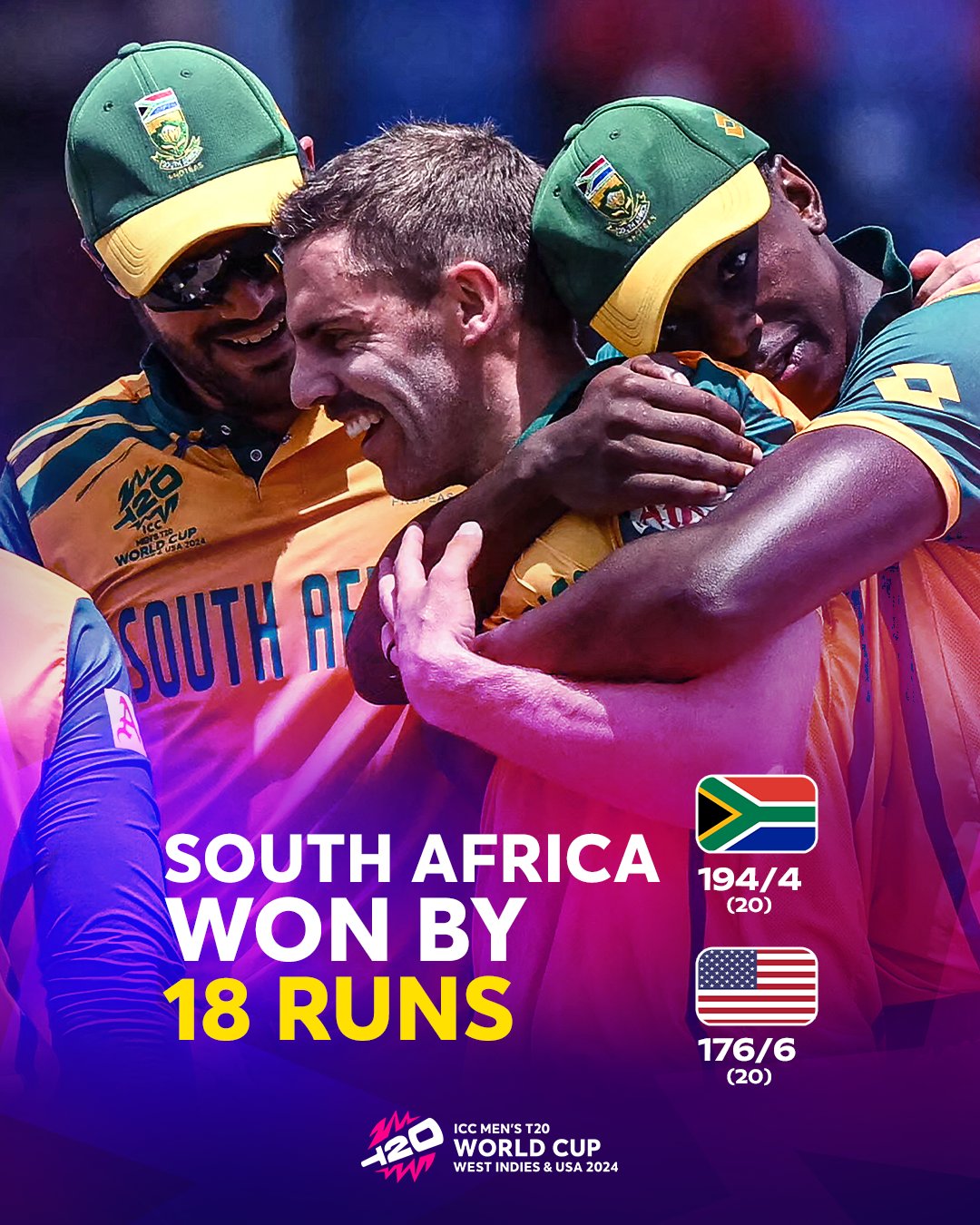दक्षिण अफ्रिकाले निर्धारित ओभरमा ४ विकेट गुमाएर १९५ रन बनाएको थियो । जवाफमा अमेरिकाले निर्धारित ओभरमा ६ विकेट गुमाएर १७६ रन बनाएपछि खेलको नतिजा १८ रनले दक्षिण अफ्रिकाको पक्षमा गयो । समूह चरणमा पाकिस्तानलाई सुपर ओभरमा स्तब्ध र क्यानडाविरुद्ध १९५ रनको लक्ष्य पछ्याउँदै सनसनी मच्चाएको अमेरिकाले सुपर आठमा दक्षिण अफ्रिकाविरुद्ध निरास बन्यो ।