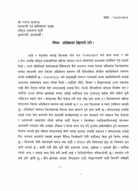 राजीनामा पत्रमा बोधार्थ अध्यक्ष राजेन्द्र लिङ्देन र संयोजित संगठन समन्वय विभागका प्रमुख गोपाल दाहाललाई दिइएको छ। आफ्ना सहकर्मीलाई आफ्ना कारणले कामकाजमा अप्ठेरो परेको भन्दै उनले बुधबार राजीनामा दिएकी हुन् ।उनले राष्ट्रिय प्रजातान्त्रिक महिला संगठनको अध्यक्ष, राप्रपाको साधारण सदस्यबाटै आफूले राजीनामा दिएको उल्लेख गरेकी छन्।