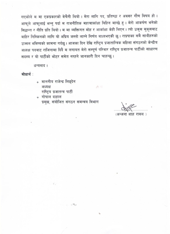 काठमाडौं । राष्ट्रिय प्रजातन्त्र पार्टी (राप्रपा) को भ्रातृ संस्था राष्ट्रिय प्रजातान्त्रिक महिला संगठनकी अध्यक्ष अन्जना शाह रावलले पदबाट राजिनामा दिएकी छन् । उनले दिएको राजिनामा पत्रमा आफूले अध्यक्ष पद त्यागेको र आफूलगायत परिवारका सदस्य अबदेखि राप्रपाको साधारण सदस्य र भोटरसमेत नरहेको उल्लेख गरेकी छन् ।