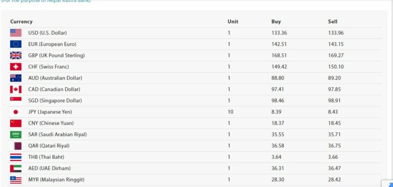 राष्ट्र बैंकका अनुसार आइतबार अमेरिकी डलर एकको खरिद दर १३३ रुपैयाँ ३६ पैसा रहेको छ भने बिक्री दर १३३ रुपैयाँ ९६ पैसा रहेको छ ।