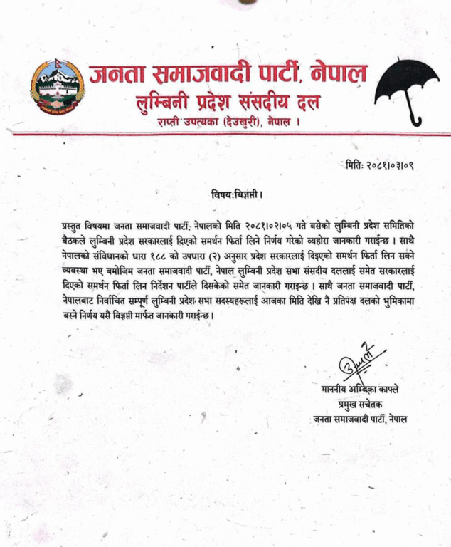 काठमाडौं । उपेन्द्र यादव नेतृत्वको जनता समाजवादी पार्टी (जसपा) नेपालले लुम्बिनी प्रदेश सरकारलाई दिएको समर्थन फिर्ता लिएको छ ।