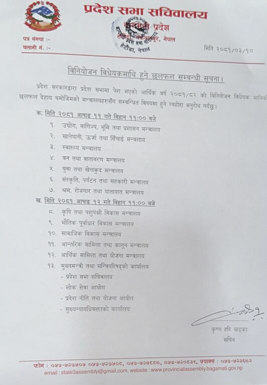 आज उद्योग, वाणिज्य, भूमि तथा प्रशासन मन्त्रालय, खानेपानी, ऊर्जा तथा सिँचाई मन्त्रलाय, स्वास्थ्य मन्त्रालय, वन तथा वातावरण मन्त्रालय, युवा तथा खेलकुद मन्त्रालय, संस्कृति, पर्यटन तथा सहकारी मन्त्रालय र श्रम, रोजगार तथा यातायात मन्त्रालयको आर्थिक विनियोजनमाथि मन्त्रालयगत छलफल हुने कार्यसूचीमा उल्लेख छ ।