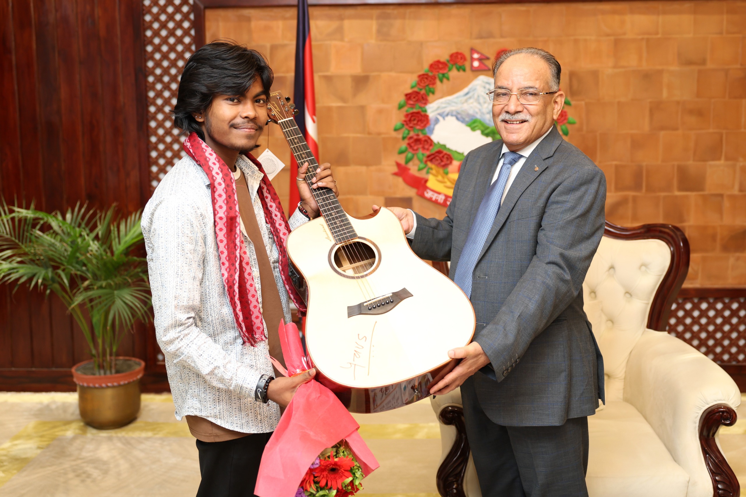काठमाडौं । नेपाल आइडल सिजन पाँचका विजेता करण परियारलाई प्रधानमन्त्री पुष्पकमल दाहालले बधाई तथा उपहार दिएका छन् । बुधबार बिहान परियारलाई प्रधानमन्त्री निवास बालुवाटार बोलाएर दाहालले बधाई दिँदै गितार उपहार दिएका हुन् ।