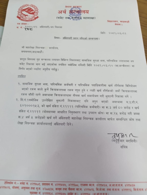अर्थ मन्त्रालयको बजेट तथा कार्यक्रम महाशाखाले महालेखा नियन्त्रक कार्यालय, अनामनगरलाई अख्तियारी पठाएको हो।