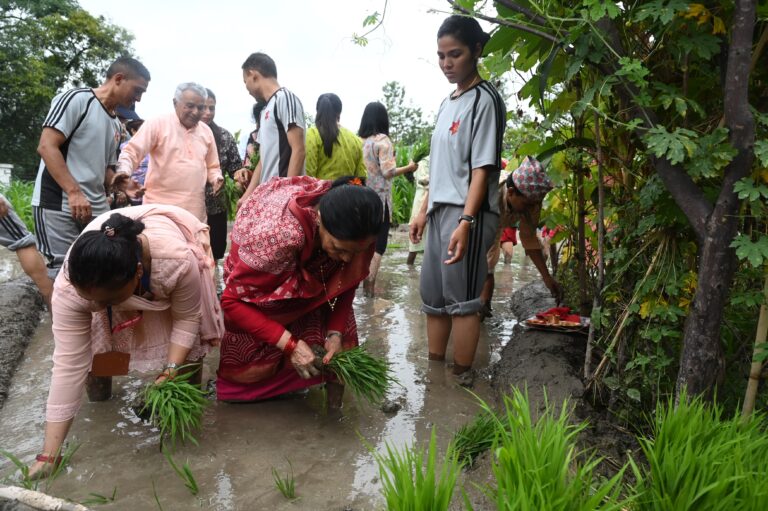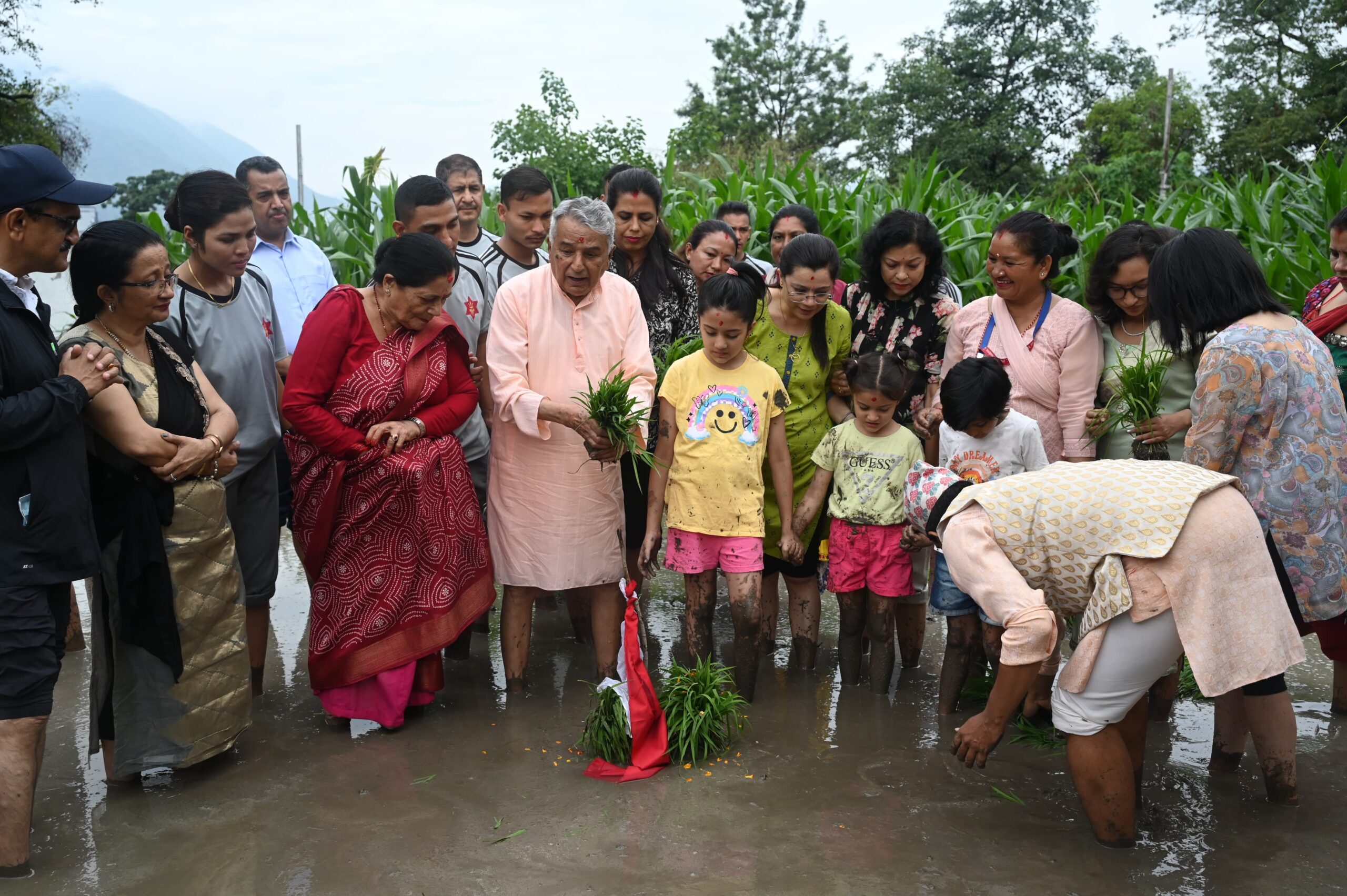 असार १५ अर्थात् राष्ट्रिय धान दिवसको उपलक्ष्यमा राष्ट्रपति भवन शीतल निवासमा शनिबार बिहान रोपाइँ कार्यक्रम सम्पन्न भएको छ । उक्त कार्यक्रमको सुरुवात गर्दै राष्ट्रपति रामचन्द्र पौडेलले कृषि पेशा, श्रम सम्मानको संस्कृति र धान उत्पादनलाई प्रोत्साहन दिन प्रतिकात्मक रुपमा रोपाइँमा सहभागी भएको जानकारी पौडेल सचिवालयले गराएको छ ।