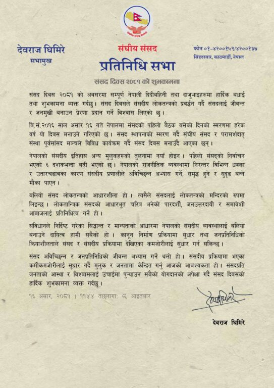 संसद् दिवसका अवसरमा आइतबार शुभकामना सन्देशमा जारी गर्दै सभामुख घिमिरेले कानुन निर्माण प्रक्रियामा सुधार तथा जनप्रतिनिधिको क्रियाशीलताले संसद र संसदीय प्रक्रियामा देखिएका कमजोरीलाई सुधार गर्न सकिने उल्लेख गरेका छन् ।