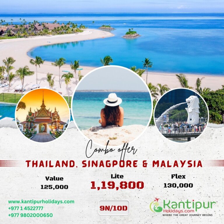काठमाडौं । घुमघाममा रुचि राख्ने नेपाली पर्यटकका लागि कान्तिपुर होलिडेजले तीन देशको कम्बो प्याकेज सार्वजनिक गरेको छ । होलिडेजले थाइल्याण्ड, मलेसिया र सिंगापुरको ९ रात १० दिनको कम्बो प्याकेज सार्वजनिक गरेको हो ।