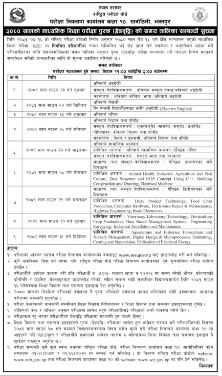 एसईई पूरक परीक्षाको तालिका सार्वजनिक