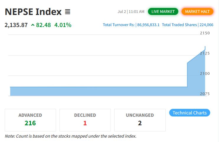काठमाडाैं । सेयर बजार खुलेको दुई मिनेटमै पहिलो सर्किट लागेको छ । नयाँ सरकार परिवर्तनको हल्लासँगै सेयर बजारमा सर्किट लागेको हो ।