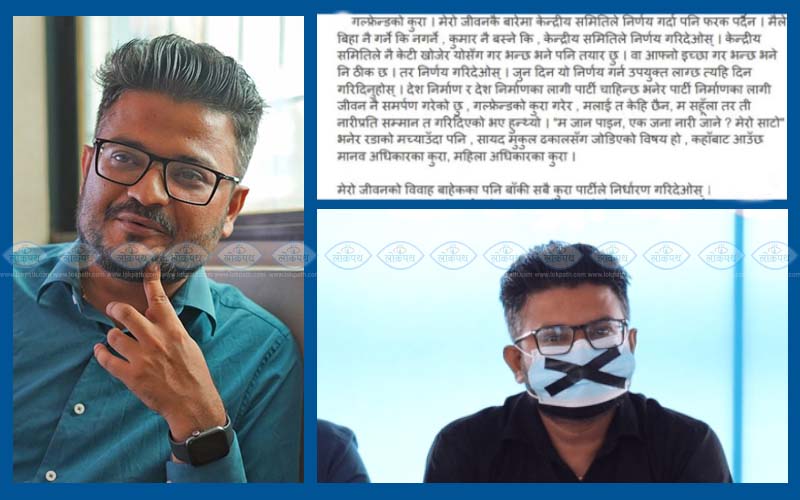 काठमाडौं । राष्ट्रिय स्वतन्त्र पार्टी (रास्वपा)का महामन्त्री मुकुल ढकालले केन्द्रीय समिति बैठकमा पेस गर्ने भनी तयार पारेको प्रस्तावमा प्रेम र विवाहको कुरा पनि उठाएका छन् । उनले पार्टी बैठकमै लिखितरुपमै यो कुरा राख्न चाहेको भएपनि पार्टी सभापति रवि लामिछानेले बोल्न दिएका छ्रैनन् । यद्यपि, सञ्चार माध्यममा भने उनको पत्र सार्वजनिक भइसकेको छ ।