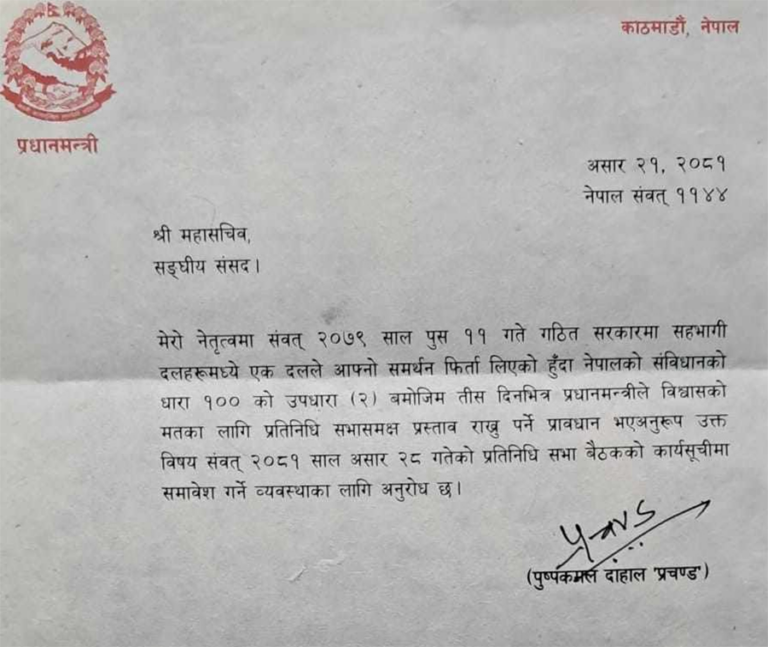 प्रधानमन्त्री दाहालले असार २८ मा विश्वासको मत लिने