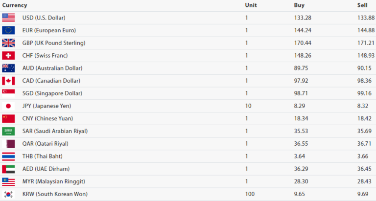 राष्ट्र बैंकका अनुसार आइतबार अमेरिकी डलर एकको खरिद दर १३३.२८ रुपैयाँ रहेको छ भने बिक्री दर १३३.८८ रुपैयाँ रहेको छ ।