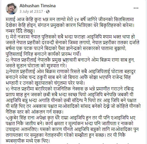 काठमाडौं । नेपाल प्रहरीका पूर्व प्रहरी उपरीक्षक (एसपी) आभूषण तिम्सिनाले १२ जना पूर्व प्रहरी महानिरीक्षक (आईजीपी) लाई १२ गम्भीर आरोप लगाएका छन् । तिम्सिनाले सामाजिक सञ्जाल फेसकुब मार्फत् गम्भीर आरोप लगाएका हुन् । उनले पूर्व आईजीपी श्यामभक्त थापादेखि वर्तमान आईजीपी वसन्तबहादुर कुँवरमाथि आरोप लगाएका छन् ।