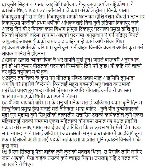 १२. अहिलेको आईजीपी वसन्तको बारेमा म के भनौं नालायक जहिले पनि नालायक नै रहन्छ । यसको बारेमा केही बोल्नु मुर्खता हुन्छ किनकि यो केही बोल्न लायक नै छैन ।