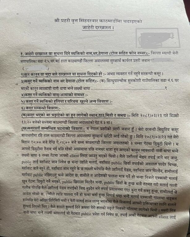 ‘विद्युतीय कसुर थापाथलीमा रही हाल काठमाडौं जिल्ला अदालतमा सुरक्षार्थ खटिँदै आइरहेको छु । मिति २०८१।०३।२३ गते मेरो बिहान १०ः०० बजे देखि ऐ. ०४ः०० बजेसम्म काठमाडौं जिल्ला अदालतको ३ नम्बर गेटमा ड्युटी थियो । म आफ्नो ड्युटीमा तैनाथ भई बसिरहेको अवस्थामा पछि नामथर थाहा हुन आएका कानुन व्यवसायी नानी थापा भन्ने लक्ष्मी थापा ३ नम्बर गेटमा आफ्नो क्लाइन्ट लिएर आउनु भएको थियो । मैले उहाँलाई मेडम तपाई जाने भए जानु, पब्लिकलाई यहाँबाट जान निषेध छ भन्दा उहाँले मलाई, यहाँबाट पब्लिक छिर्दा तपाईँको अदालत पल्टेर थिच्छ ? यहाँबाट जानै नहुने हो, यहाँबाट जान नहुने के छ त्यस्तो भनेपछि मैले उहाँलाई मेडम, यहाँबाट जान मिल्दैन, हामीलाई यहाँबाट पब्लिक नछिराउनु भन्ने आदेश छ, हामीले त आदेशको पालना मात्र गर्ने हो भन्दा निजले एक्कासी मलाई खुब गेटमा ड्युटी गर्ने भएको, पब्लिक छिराउन मिल्दैन भन्छ, पब्लिक छिर्दा के हुन्छ भन्दै तँ तँ म म गरी मलाई गाली गलौच गरेपछि मैले उहाँलाई मेडम तपाईँको चित्त बुझ्दैन भने तपाई प्रशासनमा गएर कुरा गर्न सक्नु हुन्छ, हामीलाई जे आदेश गरेको छ, हामीले त्यही पालना गर्ने हो भन्दा ‘बढ्दा हुन्छ सिपाही भएर’ भन्दै मलाई एक्कासी गालामा चड्कन हानेपछि मेरो आँखा तिरिमिरी भयो र फेरि मलाई हान्न लाग्नु भएकोमा मैले निजलाई आफ्नो प्रतिरक्षाका लागि हातले हुत्त्याई दिएको थिएँ । मैले हातले हुत्त्याई दिने क्रममा मेरो हातको नङले निजको गालामा लागेको थियो । यसरी निज नानी थापा भन्ने लक्ष्मी थापालाई यो गेटबाट पब्लिक प्रवेश गर्न निषेध छ, तपाईँ अर्को गेटबाट आफ्नो सेवाग्राहीलाई लिएर जान सक्नु हुन्छ, तपाई आफूमात्र जाने भए जानु नभए सेवाग्राही समेत लिएर जाने भए अर्को गेटबाट जानु भन्दा निजले मेरो ड्युटीमा अवरोध गरी मलाई सार्वजनिक स्थानमा गाली गलौच गर्नुका साथै हातपात गरी अभद्र व्यवहार गरेको हुँदा निज प्रतिवादी नानी थापा भन्ने लक्ष्मी थापालाई मुलुकी अपराध संहिता २०७४ को दफा ११८(१) बमोजिम कारबाही गरी पाऊँ ।’