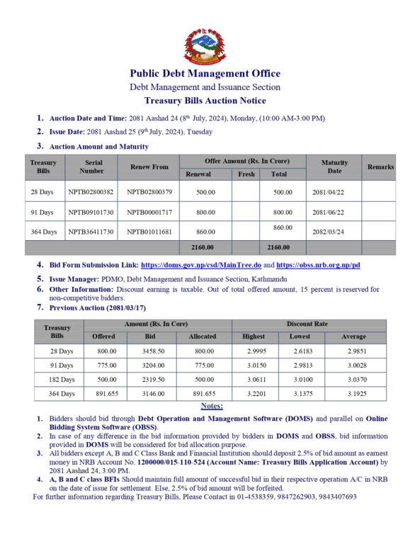 सार्वजनिक ऋण व्यवस्थापन कार्यालयले २८ दिन, ९१ दिन र एक वर्षको ट्रेजरी बिल नवीकरण गर्न लागेको हो । भोलि (मंगलबार) जारी हुने यस ट्रेजरी बिलका लागि आज(सोमबार) दिउँसो ३ बजे बोलकबोल गर्नेछ ।