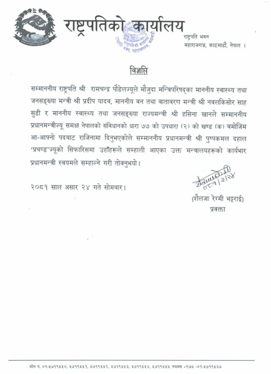 प्रचण्ड सरकारमाथिको समर्थन फिर्ता लिँदै जसपाका स्वास्थ्य तथा जनसंख्यामन्त्री प्रदीप यादव, वन तथा वातावरण मन्त्री नवलकिशोर साह र स्वास्थ्य राज्यमन्त्री हसीना खानले असार २१ गते साँझ दिएकाे राजीनामा स्वीकृत गरी ती मन्त्रालयको जिम्मेवारी प्रधानमन्त्री आफैँले सम्हालेका हुन् ।