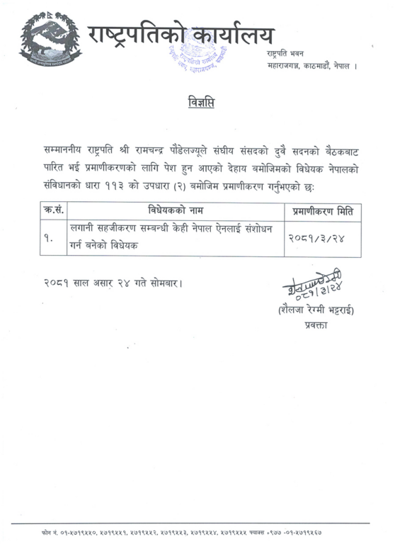 राष्ट्रपति कार्यालयकी प्रवक्ता शैलजा रेग्मी भट्टराईले नेपालको संविधानको धारा ११३ को उपधारा (२) बमोजिम उक्त विधेयक प्रमाणीकरण भएको बताएकी छन् ।